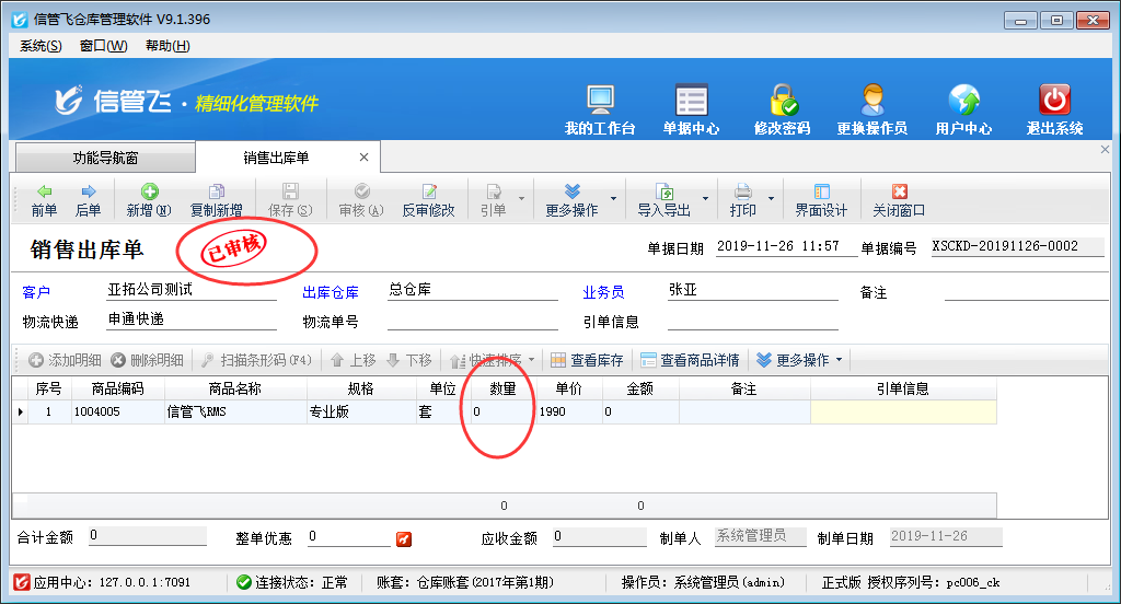 信管飛RMS(進銷存管理軟件)、信管飛送貨單軟件、信管飛倉庫管理軟件內(nèi)都可以設(shè)置開單時業(yè)務(wù)單據(jù)明細數(shù)量允許為0,本篇文章以信管飛倉庫管理軟件為例詳細介紹一下在軟件內(nèi)如何設(shè)置業(yè)務(wù)單據(jù)明細數(shù)量允許為0? 在功能導航窗點擊“系統(tǒng)管理”——》“系統(tǒng)參數(shù)配置”——》“業(yè)務(wù)參數(shù)”可以進入到“業(yè)務(wù)參數(shù)”配置界面,在業(yè)務(wù)單據(jù)明細參數(shù)內(nèi)打勾啟用“業(yè)務(wù)單據(jù)明細數(shù)量允許為0”參數(shù),如下圖所示。 設(shè)置完成之后,在功能導航窗點擊“銷售管理”——》“銷售出庫單”,新增銷售出庫單,添加商品“信管飛RMS”,數(shù)量錄入
