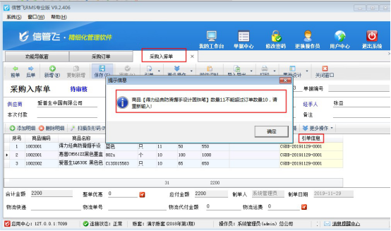 客戶在采購貨品時有時需要先由庫存人員根據(jù)實際庫存開采購訂單,然后采購人員根據(jù)采購訂單進行采購入庫。為避免采購數(shù)量大于訂單數(shù)量,軟件支持控制采購數(shù)量不可超過訂單數(shù)量,本文以“信管飛RMS軟件”為例,示范下如何設(shè)置“采購數(shù)量不可超過訂單數(shù)量”。 在功能導航窗點擊“系統(tǒng)管理”—》“系統(tǒng)參數(shù)配置”—》“業(yè)務(wù)參數(shù)”,即可進入到“業(yè)務(wù)參數(shù)”界面,勾選“采購數(shù)量不可超過訂單數(shù)量”參數(shù),然后點擊“保存”按鈕保存配置,如下圖所示。 設(shè)置完之后,在功能導航窗點擊“采購管
