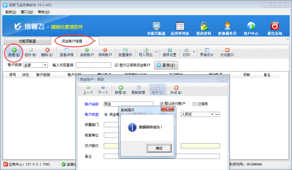 收款結(jié)算單用來登記收款信息(收款對象即客戶、收款賬戶、收款金額、經(jīng)手人等),并結(jié)銷應(yīng)收款記錄。部分用戶在剛開始使用送貨單軟件對軟件功能不熟悉,首次對應(yīng)收款進行收款結(jié)算,錄入收款金額時會提示:默認收付款資金賬戶不存在,請先設(shè)定默認收付款資金賬戶!(如下圖所示)無法繼續(xù)填開收款結(jié)算單。 這種情況是因為在系統(tǒng)內(nèi)沒有維護收款賬戶導致的,請在功能導航窗點擊“基礎(chǔ)資料”—》“資金賬戶”打開資金賬戶管理界面增加資金賬戶即可,如下圖所示。 資金賬戶新增之后,重新對應(yīng)收款進行收款結(jié)算即可,如何填開收款結(jié)