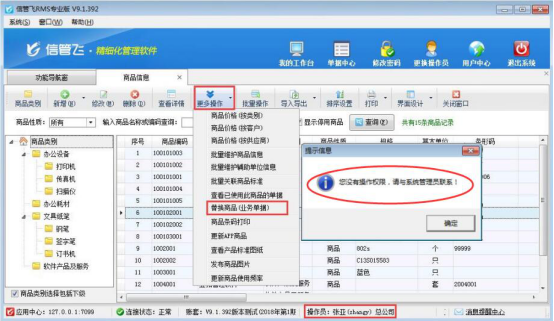 信管飛RMS軟件、信管飛倉庫管理軟件、信管飛送貨單軟件等支持設(shè)置多個操作員登錄軟件,對登錄的操作員軟件可控制操作員權(quán)限。開單過程中可能存在單據(jù)商品信息輸入錯誤現(xiàn)象,軟件可在基礎(chǔ)資料—》商品信息中對錯誤商品進行替換。為避免多個操作員重復(fù)替換出錯,可設(shè)置操作員不可批量替換商品(業(yè)務(wù)單據(jù))的權(quán)限,可指定一個操作員允許操作。 本文以“信管飛RMS專業(yè)版”為例,在功能導(dǎo)航窗點擊“系統(tǒng)管理”—》“操作員及授權(quán)”進入操作員授權(quán)及管理界面,選擇操作員組的操作員,如下圖1所示:選擇操作員“張亞”,在右側(cè)權(quán)限設(shè)置界面
