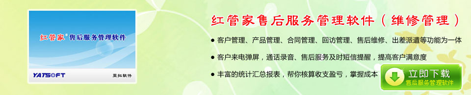 紅管家售后服務(wù)管理軟件是一款針對(duì)發(fā)貨、安裝、技術(shù)支持、維修等為一體的售后維修和客戶服務(wù)管理系統(tǒng),主要包括客戶資料管理、合同管理、銷售出貨退貨、配件/零件采購、售后服務(wù)管理、發(fā)貨郵寄管理、客戶回訪管理、出差派遣管理等。支持短信自動(dòng)通知、來電彈屏、通話錄音等。 經(jīng)典售后服務(wù)管理軟件(維修管理軟件),歡迎下載試用。下載地址:http://www.yats