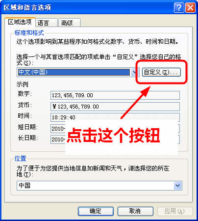 然后打開(kāi)“自定義區(qū)域選項(xiàng)”窗口,點(diǎn)擊時(shí)間按鈕查看時(shí)間格式。