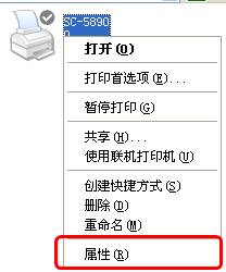 在“打印機和傳真”中,選中“SC-5890”,點擊鼠標右鍵,在右鍵菜單中點“屬性”,如下圖所示:
