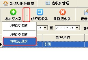 在“業(yè)務(wù)處理”-》“應(yīng)收款管理”中,點(diǎn)“增加應(yīng)收款”按鈕旁邊的小箭頭,系統(tǒng)會(huì)彈出下拉菜單,點(diǎn)擊其中的“增加應(yīng)退款”菜單項(xiàng),系統(tǒng)彈出應(yīng)退款錄入界面。如下圖所示: