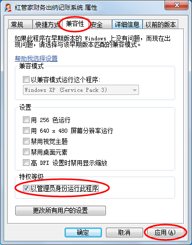 2、然后打開(kāi)“兼容性”頁(yè),復(fù)選“以管理員方式運(yùn)行”,然后點(diǎn)“應(yīng)用”按鈕。