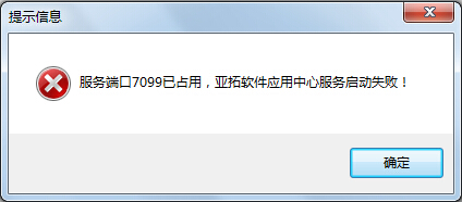 亞拓管理軟件默認(rèn)使用 7099 通訊端口,如果用戶(hù)使用多款亞拓軟件開(kāi)發(fā)的管理軟件,就需要修改一下通訊端口,否則啟動(dòng)“亞拓軟件應(yīng)用中心”程序時(shí),軟件會(huì)提示如下錯(cuò)誤信息: