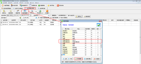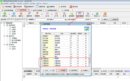 ②送貨單列表界面點擊“數(shù)據(jù)列配置”會彈出數(shù)據(jù)列配置的窗口,勾選上所需要的擴展字段,此時可以對“列名”進行更改,例如圖3中把擴展字段1的列名改為“送貨人”。最后點擊“保存配置”按鈕。