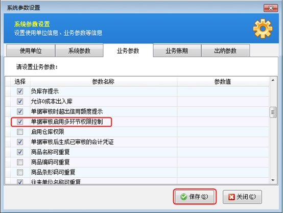 登錄亞拓管理軟件或者亞拓倉(cāng)庫(kù)管理軟件,在功能導(dǎo)航窗點(diǎn)“系統(tǒng)管理”—》“系統(tǒng)參數(shù)配置”—》“業(yè)務(wù)參數(shù)”,勾選“單據(jù)審核啟用多環(huán)節(jié)權(quán)限控制”,點(diǎn)擊“保存”按鈕,如圖1所示。