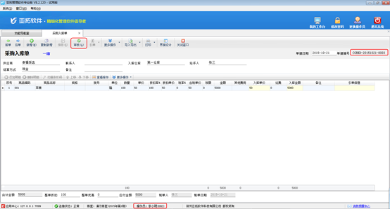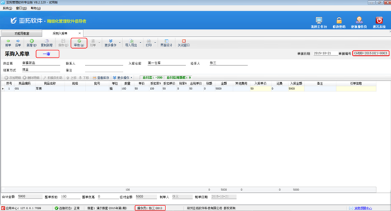 操作員“李小明”登錄亞拓管理軟件找到剛才的那個(gè)采購(gòu)入庫(kù)單,單據(jù)狀態(tài)為“一審”。