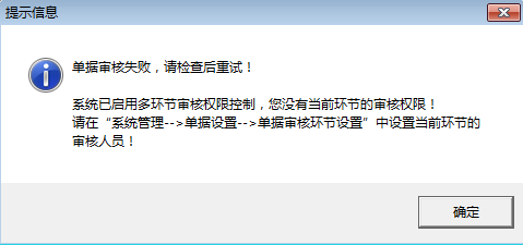 操作員“張三”沒有“二審”權(quán)限,進(jìn)行“一審”后,再點(diǎn)擊“審核”按鈕,會(huì)提示圖5所示的提示信息。