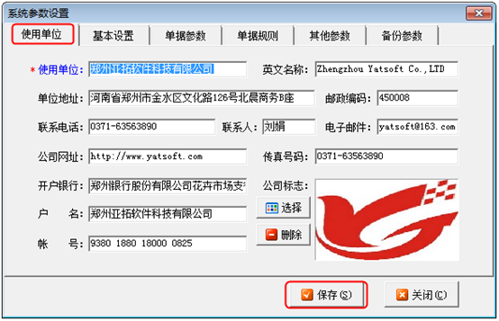 登錄軟件,在功能導航窗點“系統管理”——》“系統參數”菜單項,系統彈出如圖1所示的窗口,在“使用單位”選項下可以填寫使用單位的信息。其中單位名稱為必填項,其他項目可根據需要進行選填。如需添加公司標志,點擊“選擇”按鈕,選擇準備好的公司標志;如需刪除公司標志,點擊“刪除”按鈕。使用單位信息錄入后點擊“保存”按鈕即可。