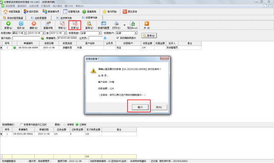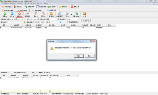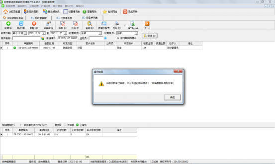 如果相應(yīng)的收款單已經(jīng)審核過了,此時(shí)刪除時(shí),系統(tǒng)會(huì)提示“當(dāng)前收款單已審核,不允許進(jìn)行刪除操作。ㄈ绱_需刪除請(qǐng)先反審)”,如下圖五所示。