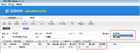 ②選擇調撥類型后,下面的單據明細會自動切換需要輸入的數據項(調入單價、調入金額、調撥差額)。