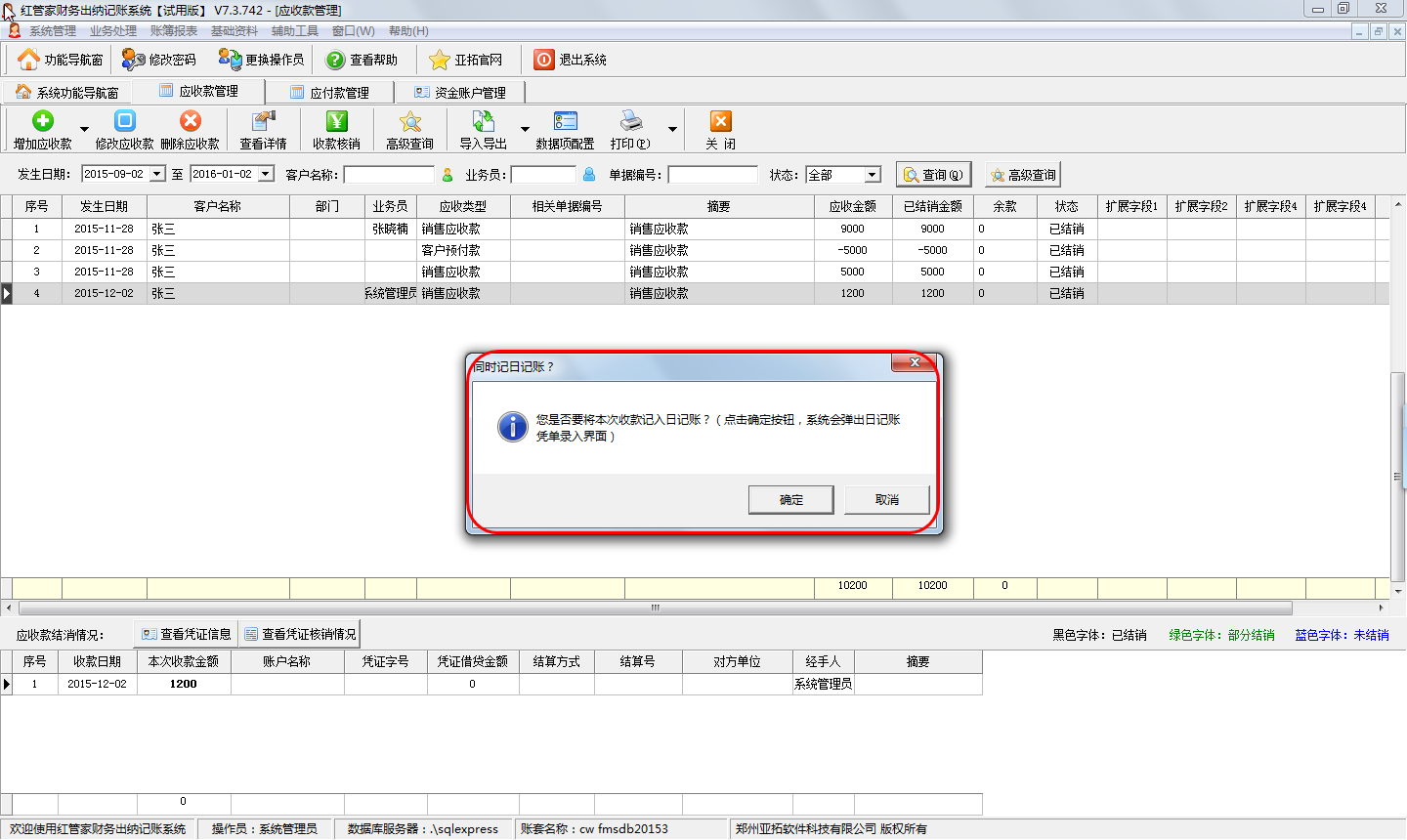 圖三 系統(tǒng)提示本次收款是否需要記入日記賬
