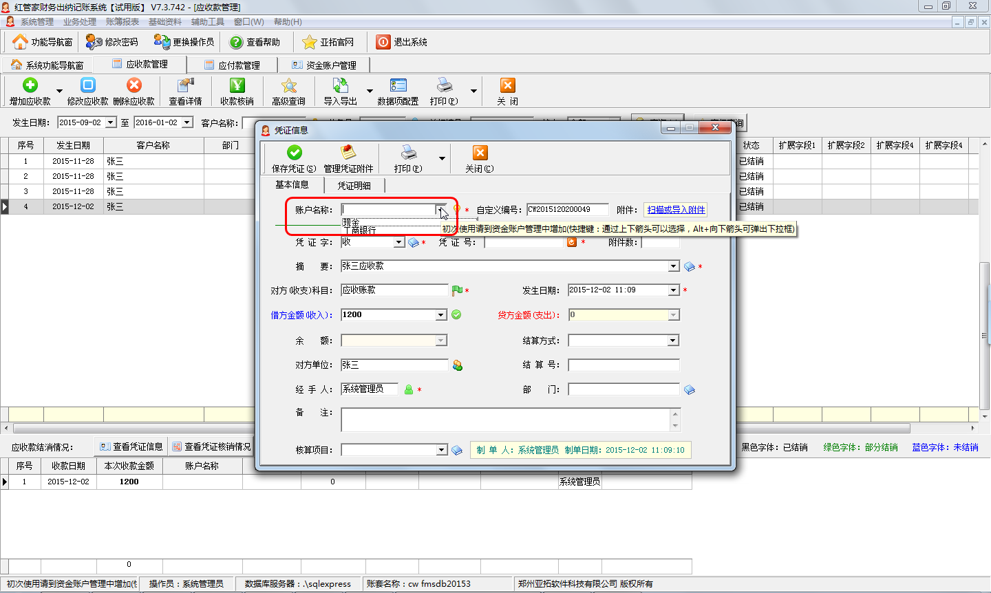 在功能導航窗中點擊“業(yè)務(wù)處理”—“應(yīng)收款”,可以進入到應(yīng)收款管理界面,在此界面可以增加應(yīng)收款、增加預(yù)收款、增加應(yīng)退款,并可以對應(yīng)收款進行收款核銷等,如下圖一所示,圖一為增加應(yīng)收款界面,增加應(yīng)收款,但是實際未收款(即資金賬戶中的資金是沒有產(chǎn)生變動的),此時是可以不用轉(zhuǎn)記憑證的,對應(yīng)收款進行收款核銷時(即資金賬戶有實際收支變化),需要將收款核銷情況記入憑證,此時軟件中的資金賬戶的余額才是正確的。