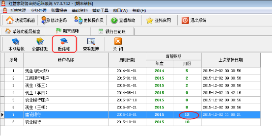 重新打開期末結賬窗口,可以看到“農業銀行”賬戶的“啟用日期”發生了變化,如圖7所示,此時可以對該資金賬戶進行反結賬操作。