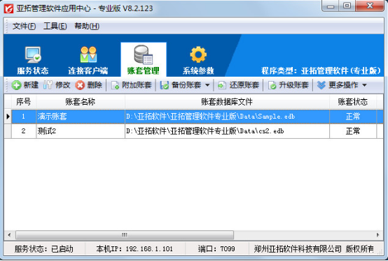 打開亞拓管理軟件應用中心(桌面右下角紅色的圖標)—》“賬套管理”即可進入賬套管理界面,如下圖1所示: