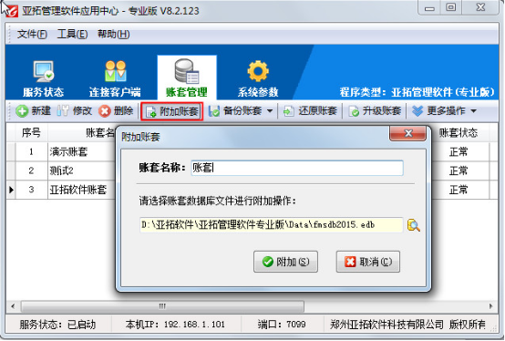 亞拓管理軟件、亞拓倉庫管理軟件中都含有賬套管理功能,賬套管理實現(xiàn)賬套數(shù)據(jù)庫的集中管理,包括新建賬套、修改賬套屬性、刪除賬套、附加賬套、備份賬套、還原賬套和升級賬套等功能。下面我們以亞拓管理軟件為例來演示一下賬套管理中各個功能具體的操作方法。