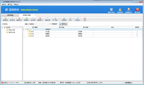 機(jī)構(gòu)部門管理實(shí)現(xiàn)對使用單位的分支機(jī)構(gòu)和部門的集中管理。“機(jī)構(gòu)”即分支機(jī)構(gòu),是指總部(總公司)下的分支機(jī)構(gòu)(如分公司、辦事處等),部門是總部或分支機(jī)構(gòu)內(nèi)部的組織。只有亞拓管理軟件專業(yè)版有“分支機(jī)構(gòu)”擴(kuò)展功能模塊,才可以維護(hù)分支機(jī)構(gòu)。亞拓管理軟件(標(biāo)準(zhǔn)版、星光版)、紅管家倉庫管理軟件(專業(yè)版、標(biāo)準(zhǔn)版)只需要維護(hù)部門即可。下面我們以亞拓管理軟件專業(yè)版為例來演示一下具體的操作步驟。