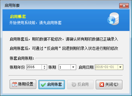 啟用賬期:是指準備從哪個月份開始使用軟件(舉例:假設當前月份為2016年4月份,但我們想從2016年2月份開始使用軟件,可以將啟用賬期設置為2016年、賬期為2,這樣我們需要整理的期初數(shù)據(jù)就應該是截止到2016-02-01前的期初應收應付款、期初商品庫存,開賬后就可以錄入2016-02-01之后的業(yè)務單據(jù))。