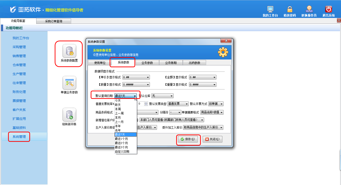在功能導(dǎo)航窗點擊“系統(tǒng)管理”——“系統(tǒng)參數(shù)配置”——“系統(tǒng)參數(shù)”,在“系統(tǒng)參數(shù)”界面可以修改“默認(rèn)查詢?nèi)掌凇保ㄟ@里修改為“最近7天”),修改完成之后點擊“保存”按鈕保存配置。