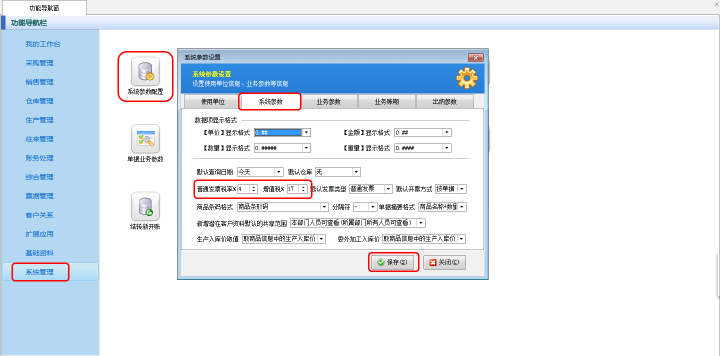 在功能導(dǎo)航窗點擊“系統(tǒng)管理”——“系統(tǒng)參數(shù)配置”——“系統(tǒng)參數(shù)”,在“系統(tǒng)參數(shù)”界面可以設(shè)置“普通發(fā)票稅率”及“增值稅發(fā)票稅率”(這里分別設(shè)置為4%及17%),設(shè)置完之后點擊“保存”按鈕保存配置,如下圖一所示。