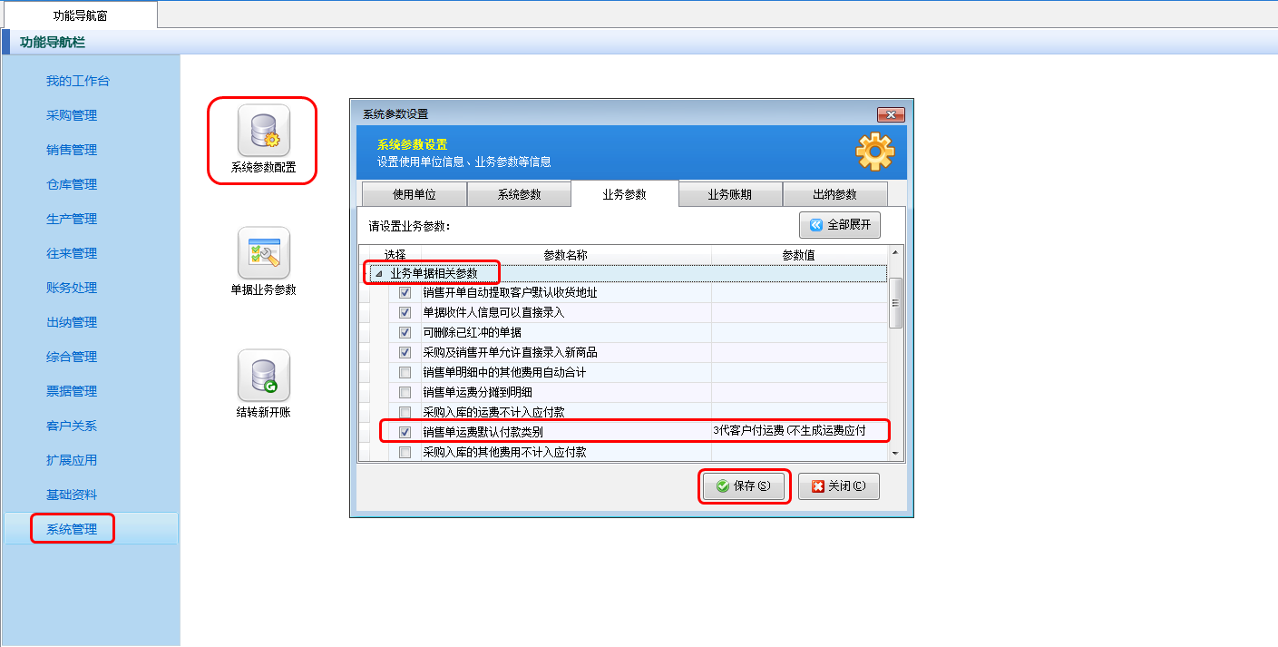 在功能導(dǎo)航窗點擊“系統(tǒng)管理”—》“系統(tǒng)參數(shù)配置”—》“業(yè)務(wù)參數(shù)”,即可進入到“業(yè)務(wù)參數(shù)”界面,在業(yè)務(wù)單據(jù)相關(guān)參數(shù)內(nèi)可以設(shè)置參數(shù)“銷售單運費默認付款類別”的參數(shù)值,此處設(shè)置為“3代客戶付運費(不生成運費應(yīng)付款,運費計入應(yīng)收金額)”,設(shè)置完點擊“保存”按鈕保存配置,如下圖一所示。