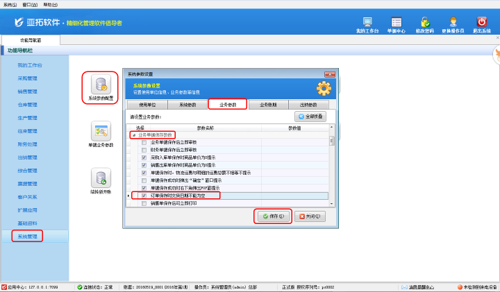 亞拓管理軟件、紅管家倉庫管理軟件、紅管家送貨單軟件等都可以設置訂單保存時交貨日期不能為空,本篇文章以亞拓管理軟件專業版為例介紹一下如何設置訂單保存時交貨日期不能為空,通過“系統管理”——》“系統參數配置”——》“業務參數”可以進入“業務參數”配置界面,在業務單據保存參數內打勾啟用“訂單保存時交貨日期不能為空”參數,如下圖一所示。