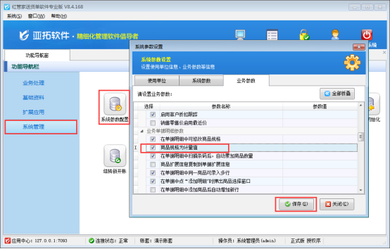 以紅管家送貨單為例,來說一下如何設(shè)置商品規(guī)格為計(jì)量值,首先設(shè)置一下系統(tǒng)參數(shù),勾選上“商品規(guī)格為計(jì)量值”的參數(shù)設(shè)置,具體設(shè)計(jì)步驟如下圖所示: