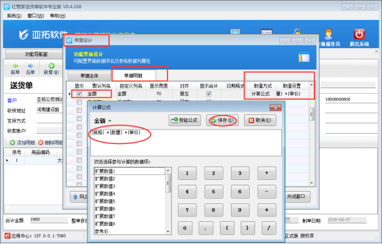 設(shè)置好參數(shù)后,功能導(dǎo)航欄點(diǎn)擊“業(yè)務(wù)處理”新開送貨單,打開界面設(shè)計(jì)選擇“單據(jù)明細(xì)”的金額,金額的取值方式選擇“計(jì)算公式”;取值設(shè)置設(shè)置為“{規(guī)格} *{數(shù)量} *{單價(jià)}”保存計(jì)算公式,最后保存界面設(shè)計(jì)。操作步驟如下圖: