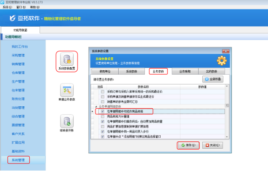 在功能導航窗中點擊“系統管理”—》“系統參數配置”,即可進入“系統參數設置”界面,點擊“業務參數”,如圖2所示,在業務單據保存參數內找到“在單據明細中可修改商品規格”參數,勾選這個參數則可以在單據明細中修改商品規格,去掉勾選這個參數則在單據明細中無法修改商品規格。現在我們勾選此參數,然后保存。