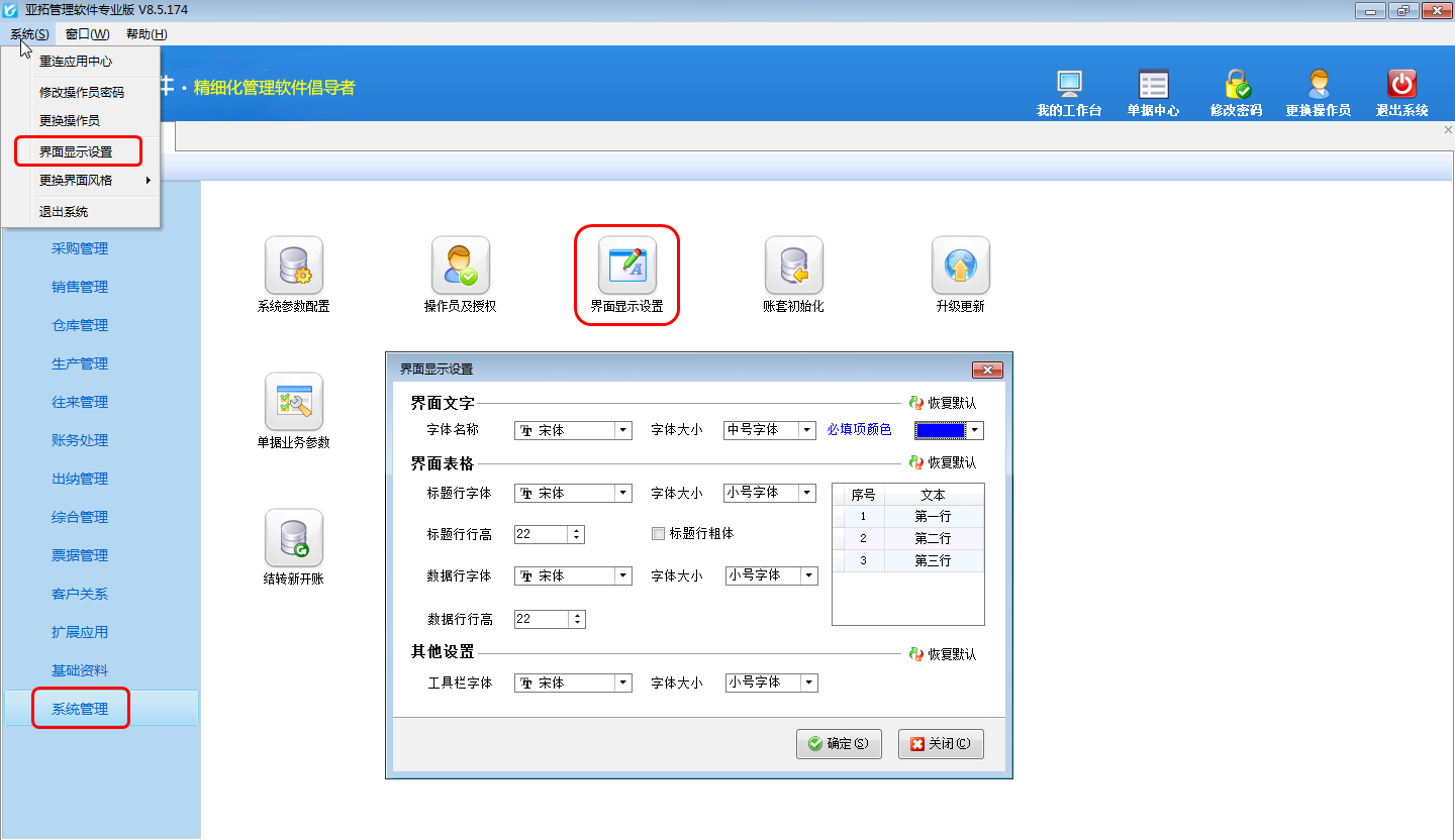 一、登錄軟件后,在軟件主窗口左上方點(diǎn)擊“系統(tǒng)”—》“界面顯示設(shè)置”可打開“界面顯示設(shè)置”窗口,在此窗口可以對(duì)界面文字及界面表格字體等進(jìn)行設(shè)置,設(shè)置并保存后請(qǐng)退出并重新登錄軟件。