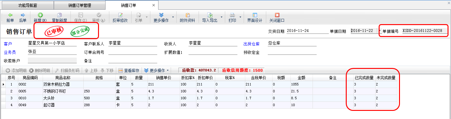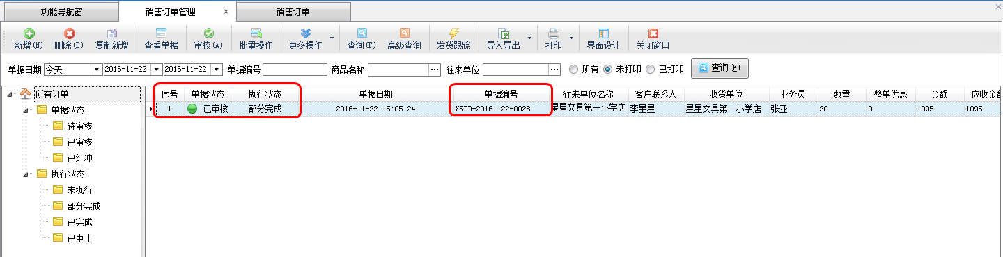 “銷售出庫(kù)單”引用“銷售訂單”出庫(kù)后,在銷售訂單管理界面查看銷售訂單執(zhí)行狀態(tài)會(huì)變?yōu)椤耙淹瓿伞被蛘摺安糠滞瓿伞睜顟B(tài)。點(diǎn)擊“查看單據(jù)”按鈕重新打開(kāi)“已完成/部分完成”的銷售訂單,可以查看銷售訂單的完成情況(已完成數(shù)量/未完成數(shù)量)。