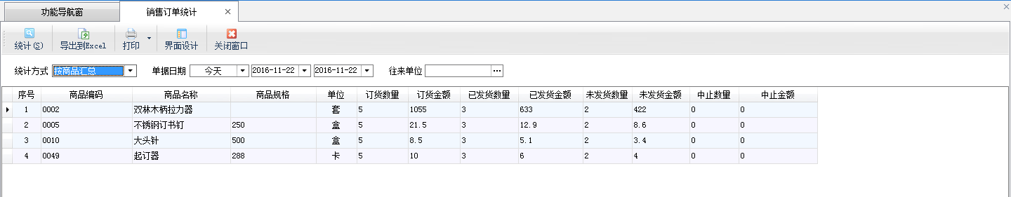銷售訂單統(tǒng)計(jì):可以從商品、業(yè)務(wù)員、往來(lái)單位三種角度匯總銷售訂貨情況、已發(fā)貨情況、未發(fā)貨情況和中止情況。點(diǎn)“統(tǒng)計(jì)方式”可以選擇具體的統(tǒng)計(jì)方式,默認(rèn)會(huì)按照商品進(jìn)行統(tǒng)計(jì)。