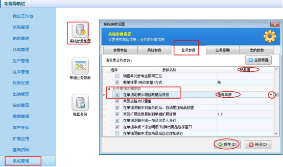 在導(dǎo)航欄選擇系統(tǒng)管理,打開系統(tǒng)管理中的系統(tǒng)參數(shù)設(shè)置,選擇業(yè)務(wù)參數(shù)找到“業(yè)務(wù)單據(jù)明細(xì)參數(shù)”中的“在單據(jù)明細(xì)中可修改商品規(guī)格”,后邊的參數(shù)值固定為銷售單據(jù)(默認(rèn)是所有單據(jù)),如下圖1所示: