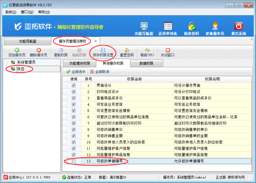 在功能導(dǎo)航窗點“系統(tǒng)管理”→“操作員及授權(quán)”即可進(jìn)入“操作員管理及授權(quán)”界面,選中操作員賬號,在“其他操作權(quán)限”界面將“可修改單據(jù)編號”權(quán)限打鉤取消,如下圖一所示,設(shè)置操作員賬號“張亞”不可修改系統(tǒng)已生成的單據(jù)編號,設(shè)置完成后點擊“保存權(quán)限設(shè)置”按鈕保存設(shè)置。