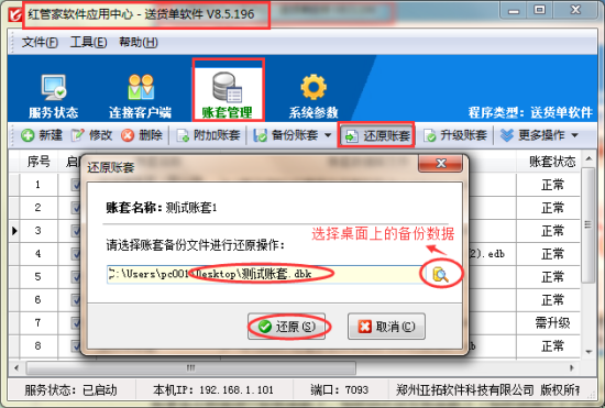 點(diǎn)擊“備份”后,賬套備份數(shù)據(jù)保存在桌面上,備份數(shù)據(jù)名字為“測(cè)試賬套.dbk”(可自己取名字),把這個(gè)賬套備份數(shù)據(jù)拷貝到新電腦上,加密鎖也放在新電腦上(加密鎖用于正式版本驗(yàn)證),新電腦需要提前安裝好軟件,軟件安裝包可到亞拓軟件官網(wǎng)上下載(軟件下載地址),然后進(jìn)行備份數(shù)據(jù)還原操作,還原操作也是在應(yīng)用中心上,點(diǎn)擊“還原賬套”選擇拷貝過來的賬套備份數(shù)據(jù):測(cè)試賬套.dbk,點(diǎn)擊還原后,數(shù)據(jù)就會(huì)恢復(fù)到新電腦上,如下圖2所示: