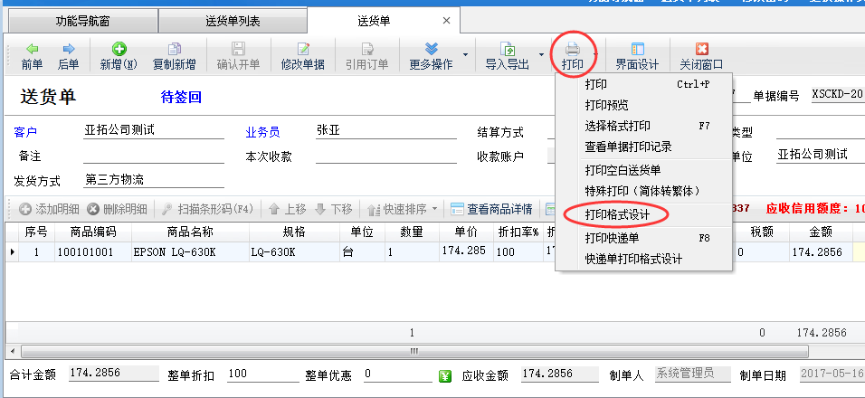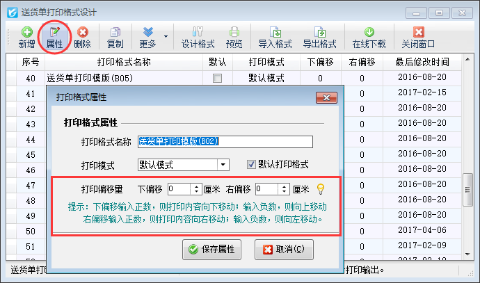 打印偏移是用于處理打印預(yù)覽時(shí)正確但是打印出來會(huì)整體錯(cuò)位的情況,一般情況下是針式打印機(jī)打印頭起始位置導(dǎo)致,而不是打印格式模版的問題,此種情況下您只需要在打印時(shí)調(diào)整打印偏移量就可以的,另外軟件內(nèi)也支持調(diào)整打印偏移量,打開一個(gè)已開的送貨單單據(jù),選擇“打印”按鈕下的“打印格式設(shè)計(jì)”,進(jìn)入打印格式設(shè)計(jì)界面,如下圖二所示。