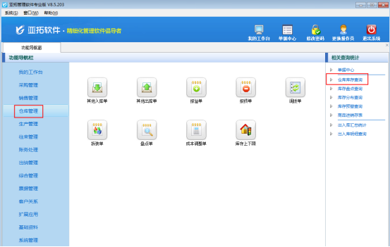 亞拓管理軟件和紅管家倉庫管理軟件都可以對倉庫信息進行管理,都可以查詢商品庫存數量。倉庫庫存查詢可以查看存貨的實時庫存情況,包括庫存數量、可用庫存數量、待入庫數量、待出庫數量,并可查看庫存成本情況。支持按照倉庫、商品性質等條件進行匯總。本篇文章以亞拓管理軟件專業版為例詳細介紹一下如何查詢商品庫存數量。