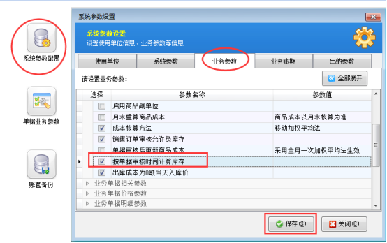按照單據(jù)審核時(shí)間管理庫(kù)存設(shè)置如下,首先需要在系統(tǒng)管理—》系統(tǒng)參數(shù)配置—》業(yè)務(wù)參數(shù)中啟用下參數(shù),如下圖1所示: