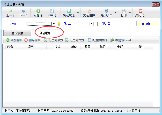 紅管家出納記賬軟件(標準版、專業版)在新增憑證時都支持錄入憑證明細,方便用戶錄入每個憑證的明細內容(系統默認沒有啟用憑證明細功能,如下圖所示),本篇文章我們以紅管家出納記賬軟件專業版為例來詳細介紹一下如何啟用憑證明細功能?