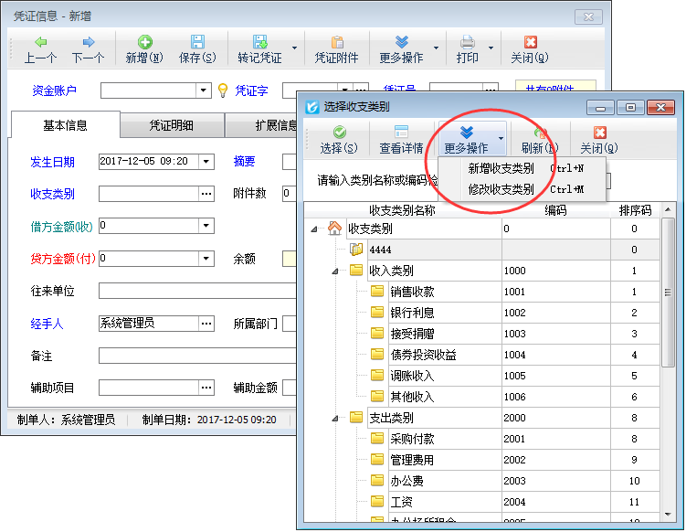 新增收支類別:點(diǎn)“新增”按鈕,可以在選擇的當(dāng)前收支類別下增加下級收支類別。