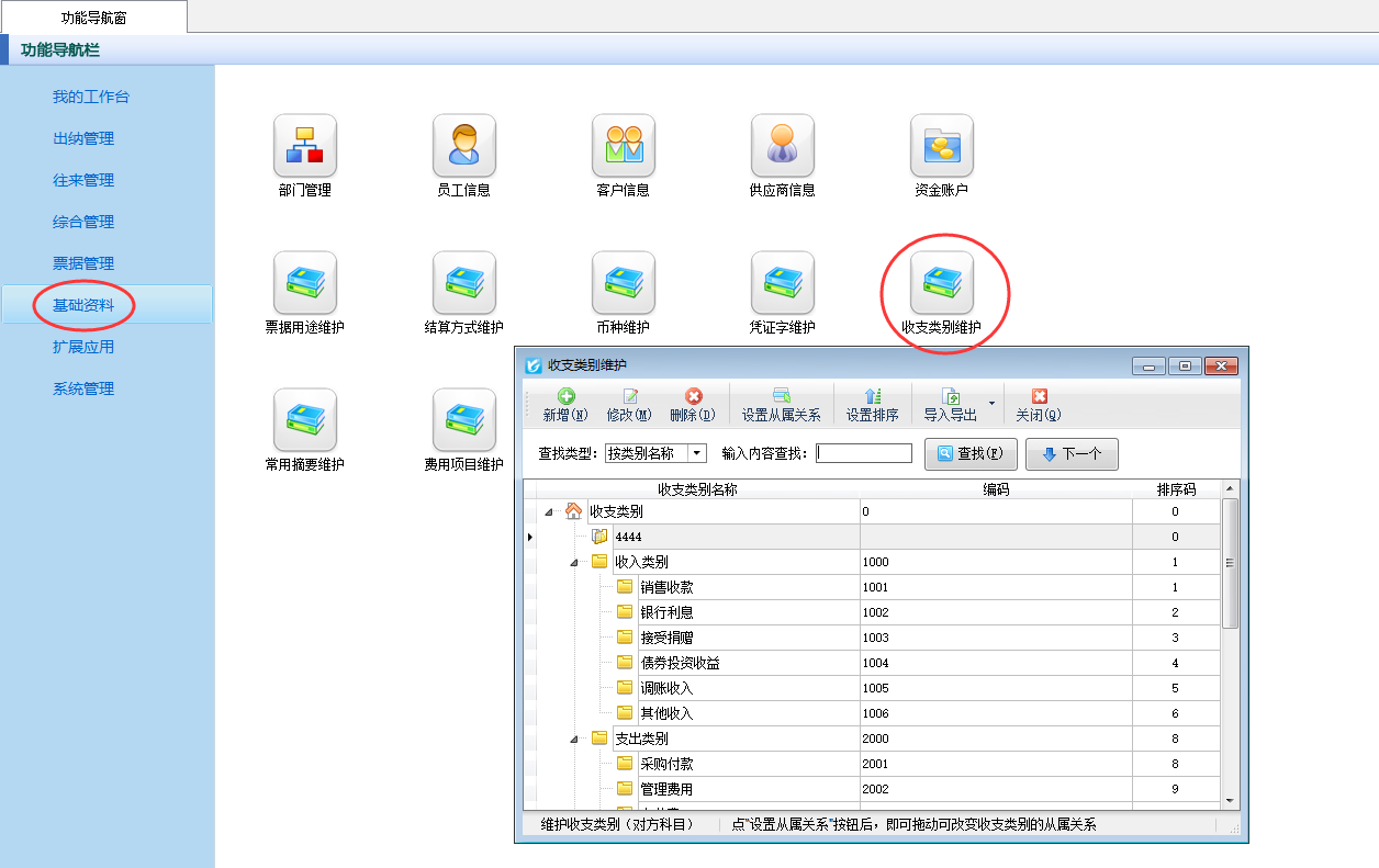 功能導(dǎo)航窗點(diǎn)擊“基礎(chǔ)資料”—》“收支類別維護(hù)”,即可進(jìn)入收支類別維護(hù)功能,其界面如下圖二所示: