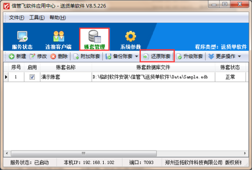 把備份數(shù)據(jù).dbk格式的文件復(fù)制到電腦桌面上,方便還原賬套進行選擇。打開應(yīng)用中心程序(紅色圖標),在賬套管理中點擊賬套文件(如沒有賬套可以新建一個新的賬套),點擊工具欄的“還原賬套”如下圖1所示: