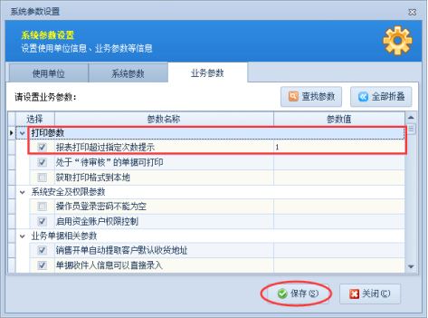 以信管飛送貨單軟件為例,示范下如何設置操作員不能超過指定的打印次數權限。首先,設置下系統報表打印次數提示,在功能導航窗點擊“系統管理”—》“系統參數配置”—》“業務參數”,在業務參數中將“報表打印超過指定次數提示”勾選上,并設置打印次數,系統默認打印次數為1,可根據自己實際需求設置。設置完成后點擊保存,如下圖1所示: