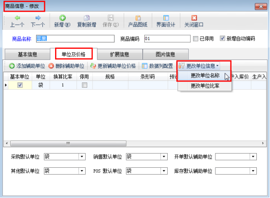 在“商品信息修改”窗口,點(diǎn)擊“單位及價(jià)格”,進(jìn)入單位及價(jià)格界面,點(diǎn)擊“更改單位信息”——》“更改單位名稱”。具體步驟如下圖展示: