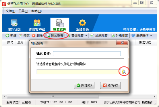 以信管飛送貨單軟件為例。示范下如何附加賬套?打開(kāi)紅色的應(yīng)用中心程序,選擇賬套管理界面,點(diǎn)擊工具欄中的“附加賬套”,點(diǎn)擊后會(huì)彈出附加賬套窗口,如下圖1所示: