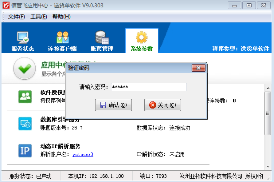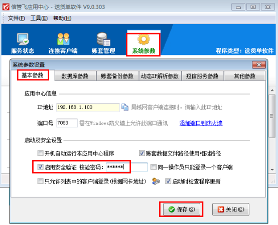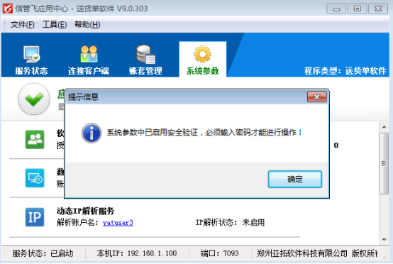 應(yīng)用中心的管理和配置會(huì)對(duì)軟件的運(yùn)行產(chǎn)生重大影響,因此軟件提供增強(qiáng)安全驗(yàn)證功能,啟用安全驗(yàn)證后執(zhí)行賬套管理、系統(tǒng)參數(shù)設(shè)置等功能時(shí)會(huì)要求輸入密碼,驗(yàn)證密碼通過后才可以進(jìn)行相應(yīng)操作。下面我們以信管飛送貨單軟件應(yīng)用中心為例詳細(xì)介紹下如何啟用安全驗(yàn)證功能。