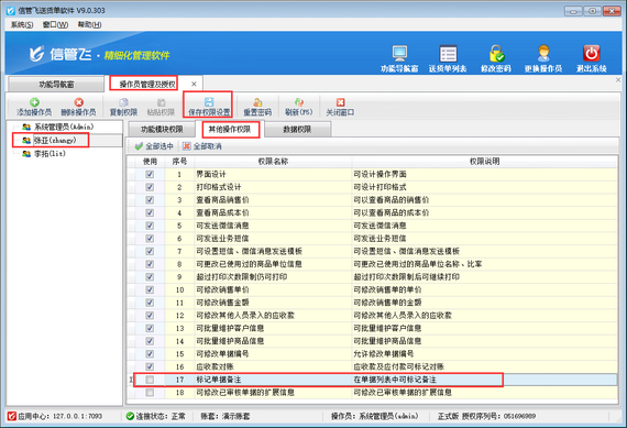 信管飛送貨單軟件支持對訂單列表、送貨單列表以及退貨單列表標記備注。如果不允許操作員標記單據(jù)備注,可以對操作員取消“標記單據(jù)備注”的權限。下面我們介紹一下在信管飛送貨單軟件中設置操作員不可標記單據(jù)備注的操作步驟。
