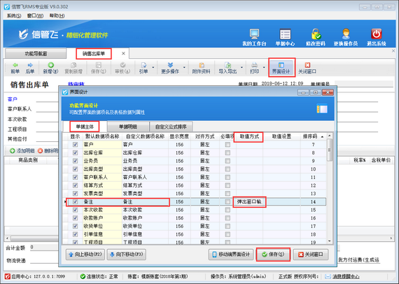 我們以信管飛RMS為例,示范下進銷存管理軟件開單錄入備注時如何彈出窗口錄入。首先打開銷售出庫單界面,在工具欄中點擊“界面設計”打開“界面設計”窗口,選擇“單據主體”中的備注項,取值方式選擇“彈出窗口輸入”,然后保存設置,如圖1所示。